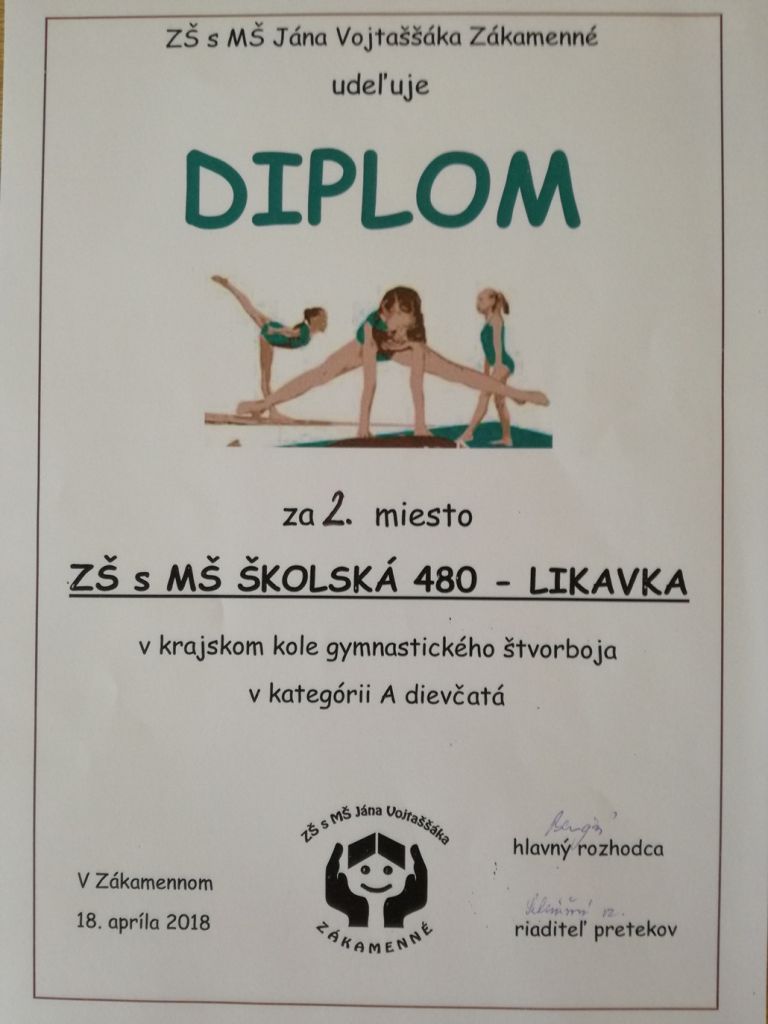 Víťazi okresného kola: Kategória „A“ dievčatá a Kategória „C“ chlapci postúpili na Krajské kolo v Zákamennom, ktoré sa konalo 18. 4. 2018. Týždeň mali žiaci na odstránenie nepatrných chybičiek a doladenie formy. S napätím sme očakávali spočítanie bodov a výsledky. A keď to prišlo – radosť preveliká, chlapci vyhrali, postúpili na Majstrovstvá Slovenska v gymnastike, ktoré sa uskutočnilo v Poprade dňa 15. 5. 2018.