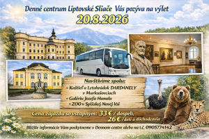 Denné centrum Liptovské Sliače pozýva na výlet, ktorý sa uskutoční 20.8.2026. Navštívime spolu: - Kaštieľ a Letohrádok DARDANELY v Markušovciach - Galériu Jozefa Hanulu - ZOO v Spišskej Novej Vsi. Výlet je určený pre seniorov, dospelých aj rodiny s deťmi. Bližšie informácie na t.č.0905774172.