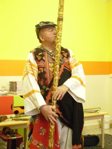 V rámci výchovného koncertu predviedol hru na archaických hudobných nástrojoch – fujare, píšťale, handrárskej píšťale, drumbli, harmonike, heligónke, gajdách, flaute a deti mali možnosť vidieť aj pastiersky bič, ktorým si pastieri plieskali pri pasení oviec.